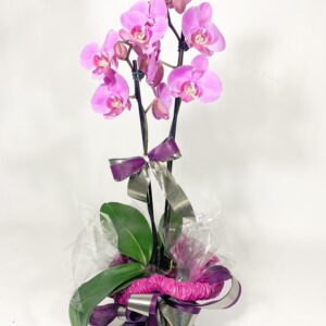 Orquídea Phalaenopsis com duas pencas. Plantada em embalagem com papéis e laço.