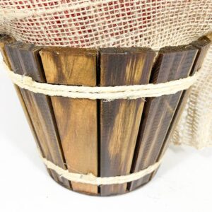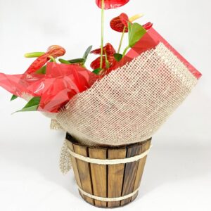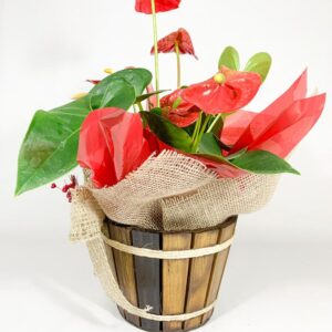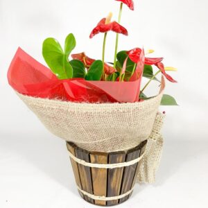Este Antúrio lindo vermelho, conta com um cachepô em madeira.