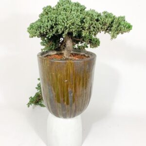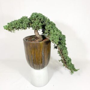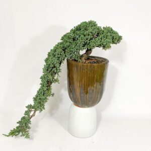 Um Bonsai pendente, isso mesmo. Perfeito para um aparador. Tem um canto precisando de um verde, diferenciado, único. Está aqui a solução. Uma árvore impecável e diferenciada. Os amantes de bonsai vão amar.