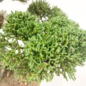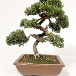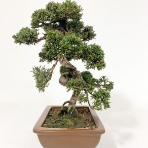 Shimpaku 9 anos todo trabalhado, plantado em um vaso de cerâmica fosco na cor marrom.