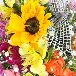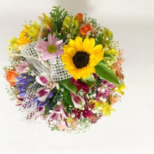 Para essa composição utilizamos um mix de flores como astromélias, margaridas, girassol, cravíneas.