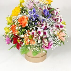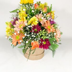 Uma caixa redonda em kraft, um lindo arranjo com mix de flores.